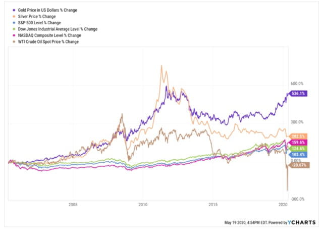 The second top coronavirus recovery stock to buy features a gold mining company. During the past 20 years, gold has risen 164.7% more than silver, jumped 235.9% further than NASDAQ, leaped 330.3% beyond the Dow Jones Industrial Average, soared 418.5% higher than the S&P 500 and trounced the falling price of oil.