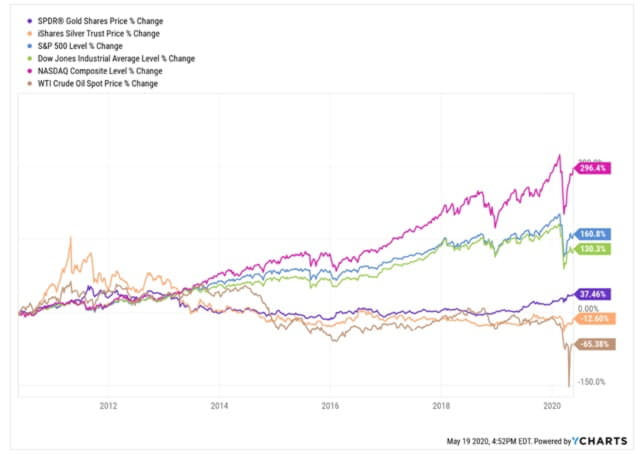 Quidel is a growth-oriented NASDAQ stock and that index during the past 10 years has beaten all other major U.S. stock indexes, gold, silver and oil as the best-performing place for investors, as the following chart shows.