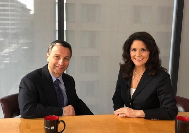 Pension fund Chairman Bob Carlson answers questions from Paul Dykewicz during an interview before social distancing became the norm after the outbreak of COVID-19.